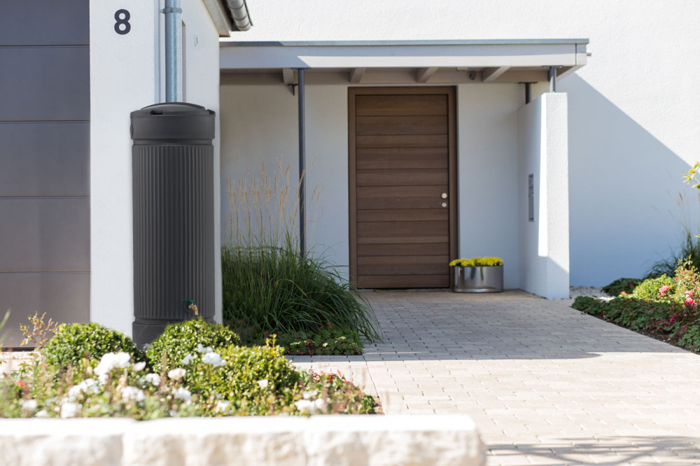 Angeschlossen am Dachrinnenfallrohr, speichert die Regensäule den anfallenden Regen, welcher dann zum Beispiel für die Gartenbewässerung genutzt werden kann.