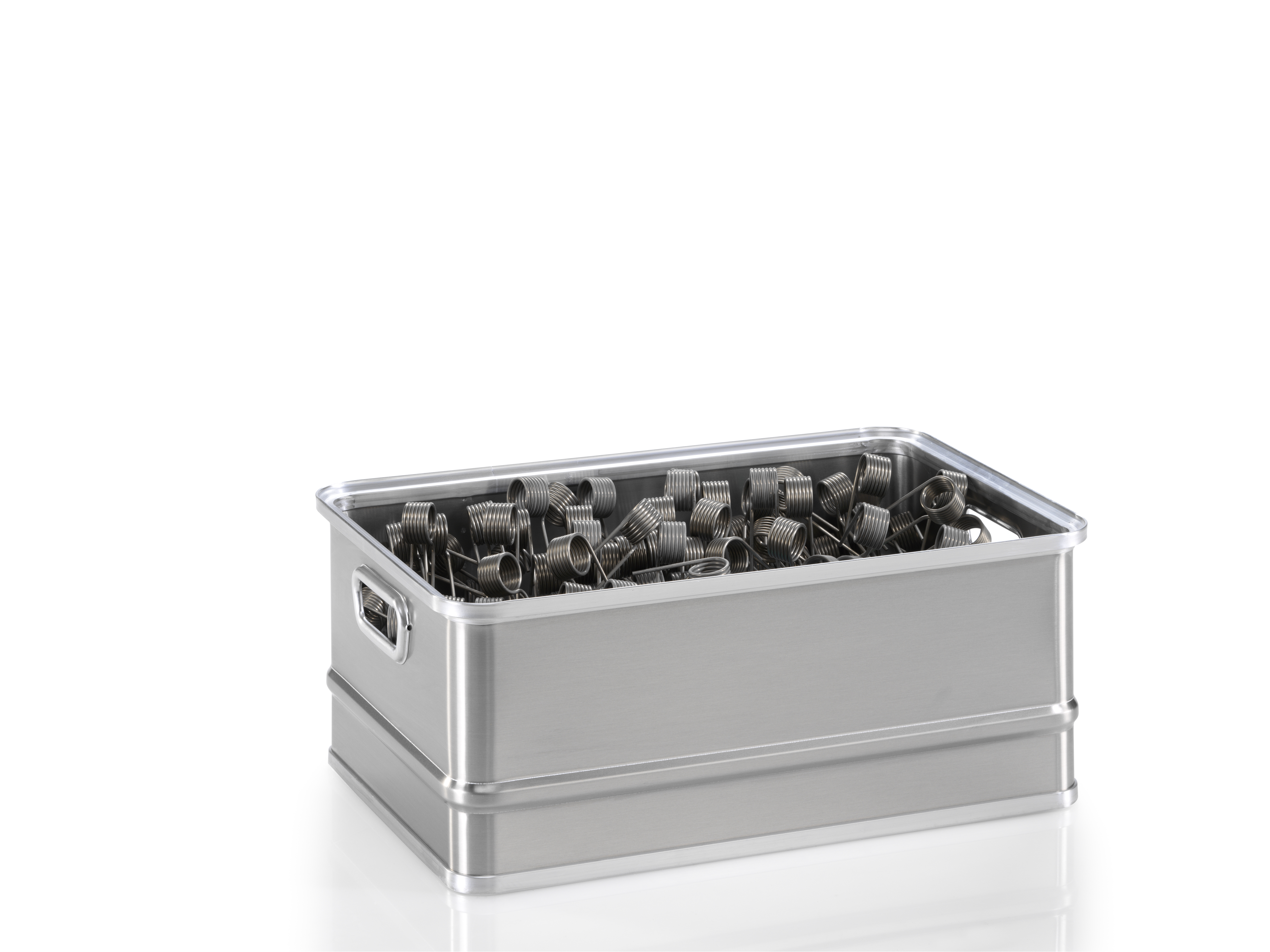 Zwei ergonomische Schalengriffe erleichtern das Handling im täglichen Einsatz. Dank der glatten Oberflächen ist der Aluminiumbehälter hygienisch, sterilisierbar, geruchsneutral und lebensmittelecht. Zusätzlich ist er für Rollbahnen geeignet und somit optimal in bestehende Logistiksysteme integrierbar.