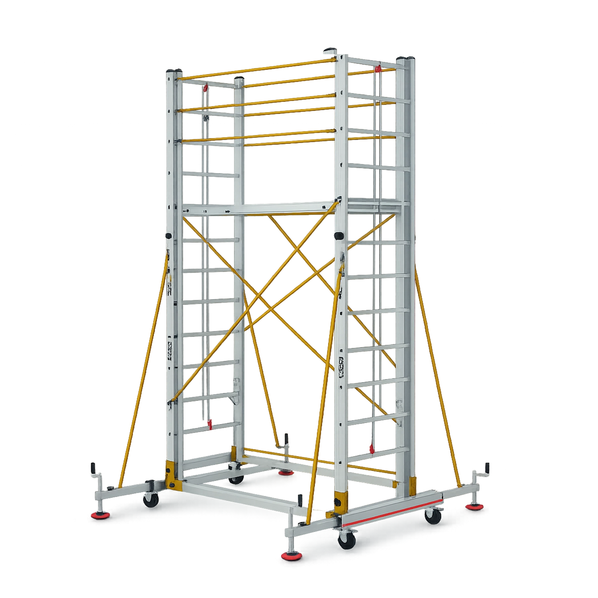 Plattformhöhe 4.41m, Plattformgrösse 1550mm x 600mmDiagonale und horizontale Streben aus Eisenrohren verbinden die Hauptleitern des Gerüsts.Dank des Q-Lock-Systems kann es sehr schnell und sicher installiert werden. Plattformhöheund Gerüsthöhe können dank des Seil- und Flaschenzugsystems alle 28 cm angepasstwerden. Die Falltür der Plattform ermöglicht es dem Benutzer, die Plattform sicher zu erreichen.Die Geländer mit einer Höhe von 100 cm sorgen für einen sicheren Bereich für den Benutzer.