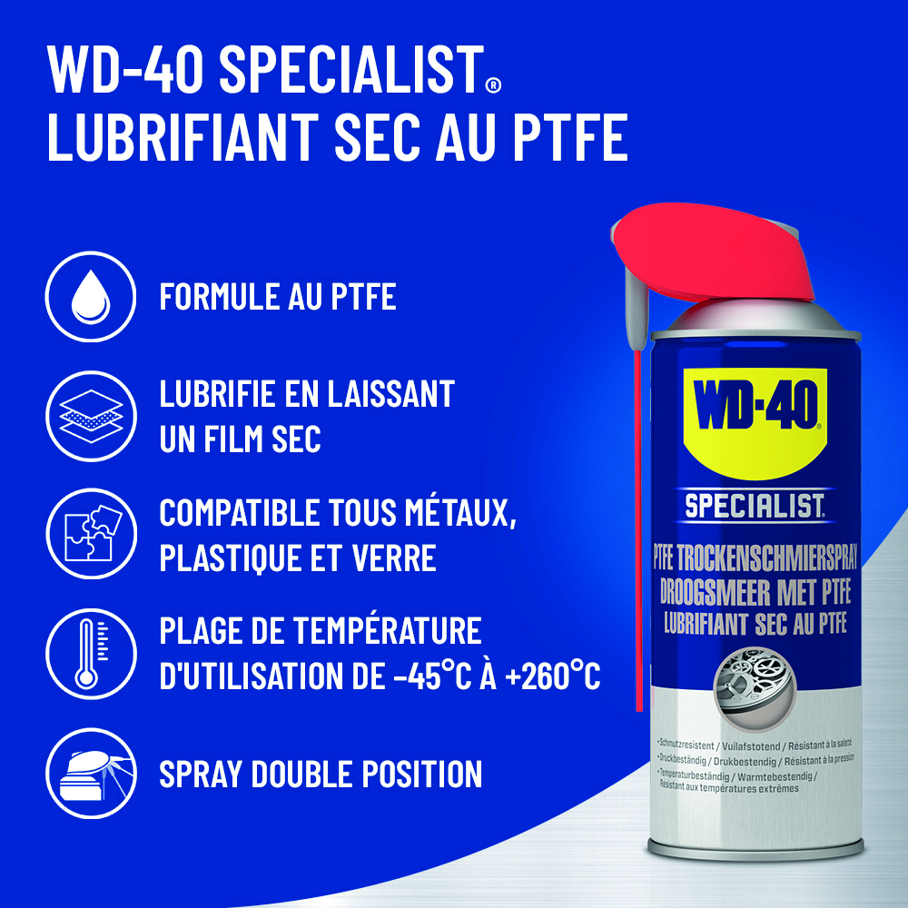 WD-40 SPECIALIST PTFE Trockenschmierspray enthält den Festschmierstoff PTFE für verbesserte Schmiereigenschaften hält auch bei hohen Temperaturen und unter hohem Druck. Der verbleibende klare Trockenschmierfilm zieht weder Staub noch Schmutz oder Öl an. Es ist außerdem ein hervorragendes Gleit- und Trennmittel, welches auf Metall, Kunststoff oder Glas angewendet werden kann.