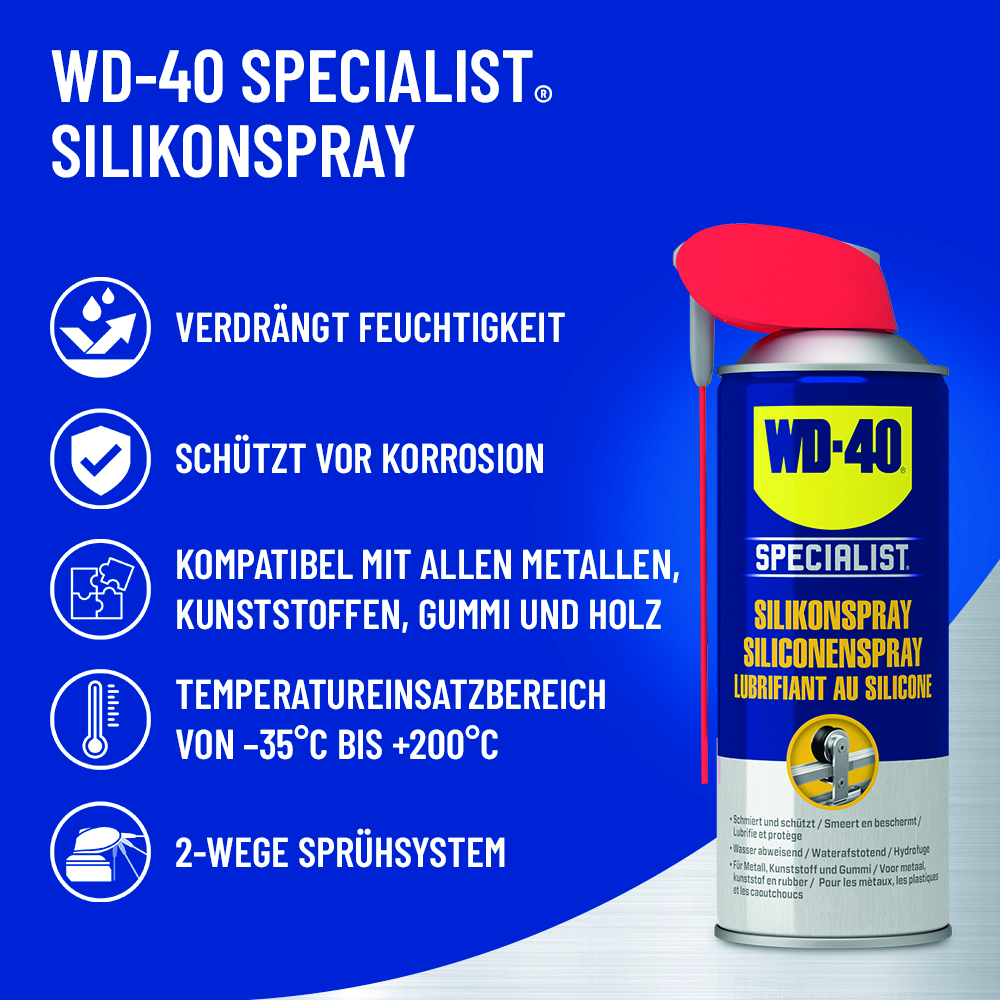 WD-40 SPECIALIST Silikonspray ist farblos, Wasser abweisend, schützt vor Feuchtigkeit und bietet hervorragenden Schmiereigenschaften. Es verhindert Blockaden und besitzt eine hohe Druckbeständigkeit. Es kann auf Metall, Kunststoff, Holz und Gummi angewendet werden.