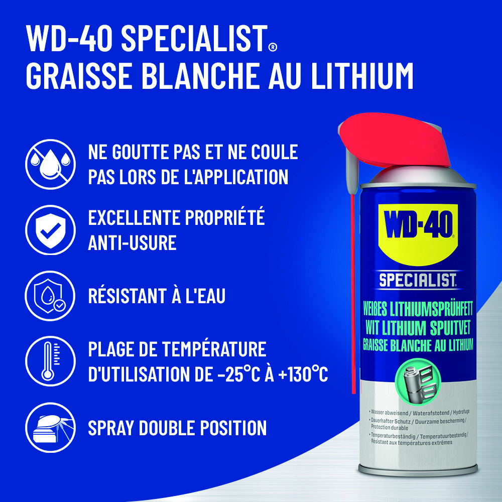 WD-40 SPECIALIST Weißes Lithiumsprühfett ist ein dickflüssiges Fettspray, welches eine lang anhaltende Schmierung ohne zu tropfen oder zu verlaufen ermöglicht. Das Produkt ist besonders geeignet, um die Reibung von Metallteilen zu reduzieren und dadurch die Verbindungen gängig zu halten. Es kann auch bei Metallverbindungen unter hohen Druckbelastungen eingesetzt werden.