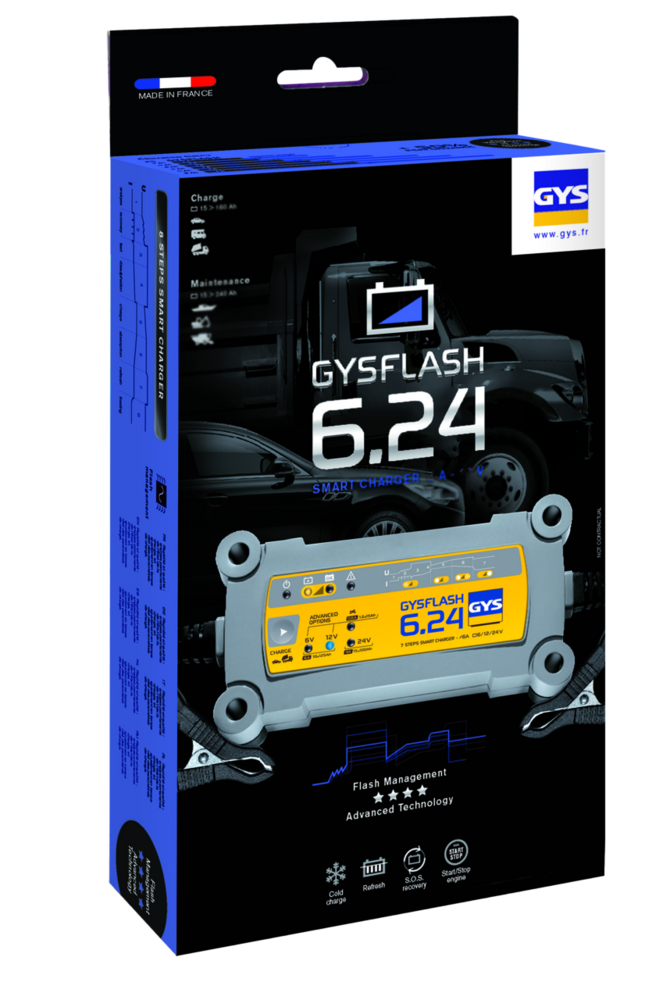 Das GYSFLASH 6.24 ist ein Ladegerät für Nutzfahrzeuge, PKWs, Oldtimer und Motorräder mit 6, 12 und 24V-Batterien.