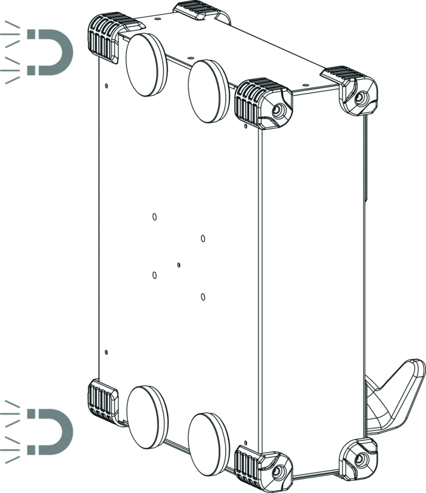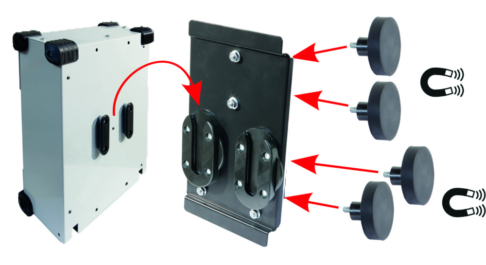 Komplettes Befestigungsset bestehend aus 4 Magneten + Metallplatte + Halterungen.