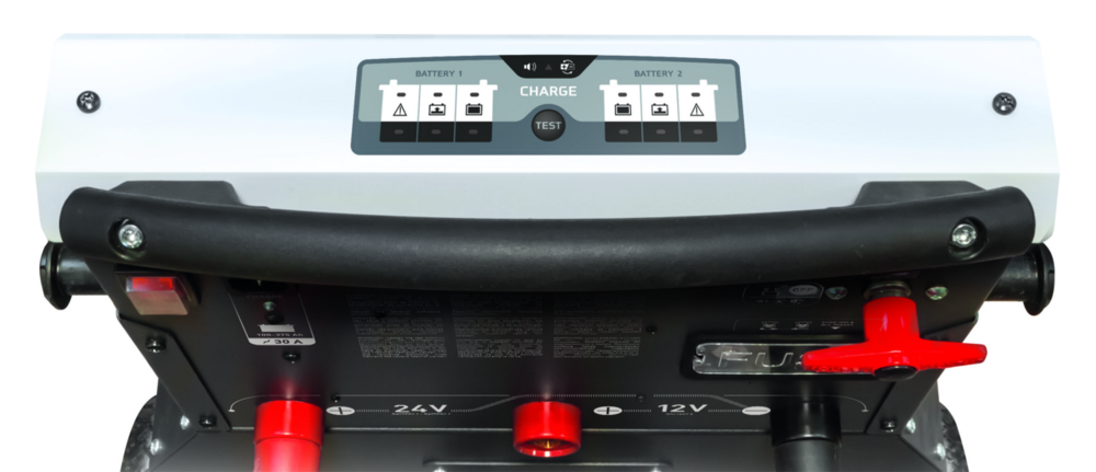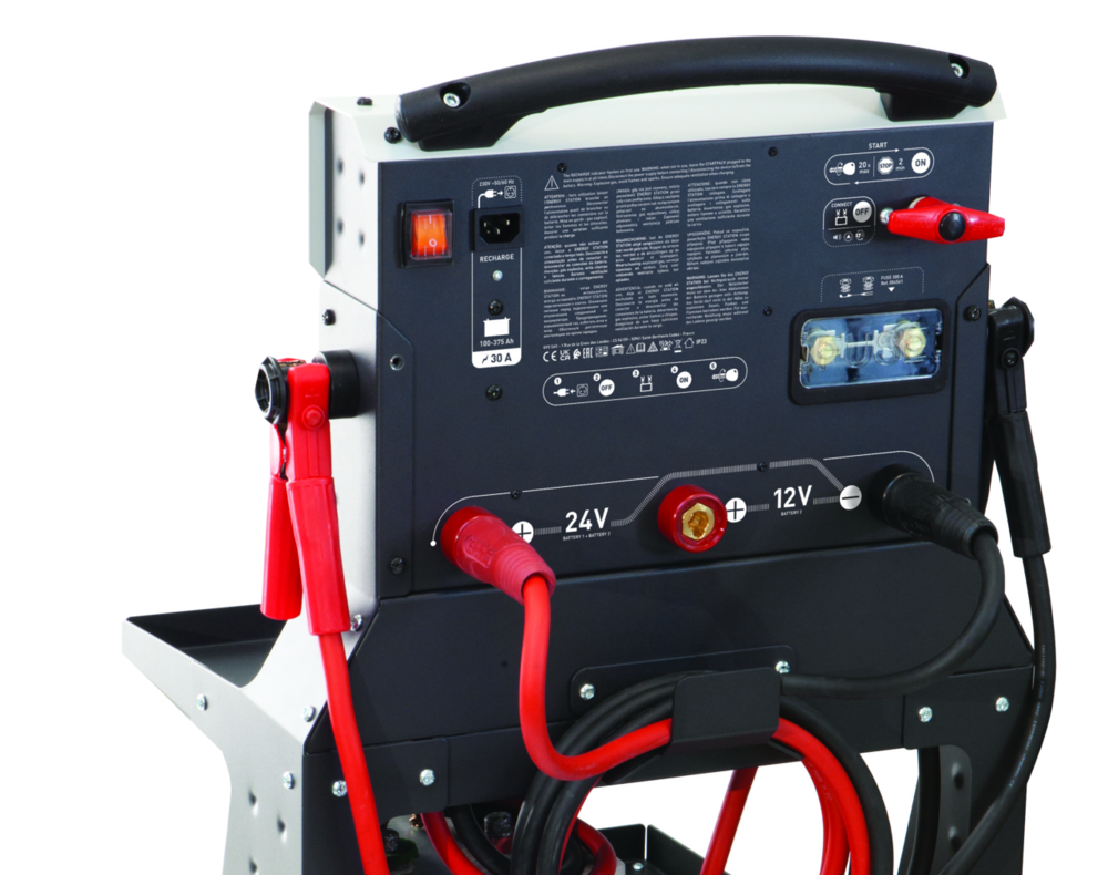 Die Energy Station FP ist ein Starterwagen für schwere 24 Volt-Maschinen (Lkw, Bau- und Landwirtschaftsmaschinen). Dieses Gerät wird ohne Batterien geliefert, die vom Benutzer ausgewählt werden können. Es verfügt jedoch über ein intelligentes automatisches 12 V/30 A-Ladegerät, mit dem Sie zwei Batterien gleichzeitig und perfekt aufladen können.