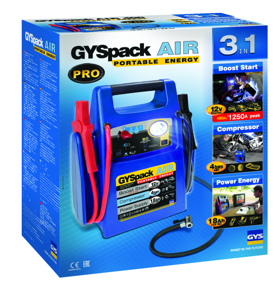 Das GYSPACK AIR Startet blitzschnell Motorräder, Autos, Wohnwagen ohne die Fahrzeugelektronik zu beschädigen.