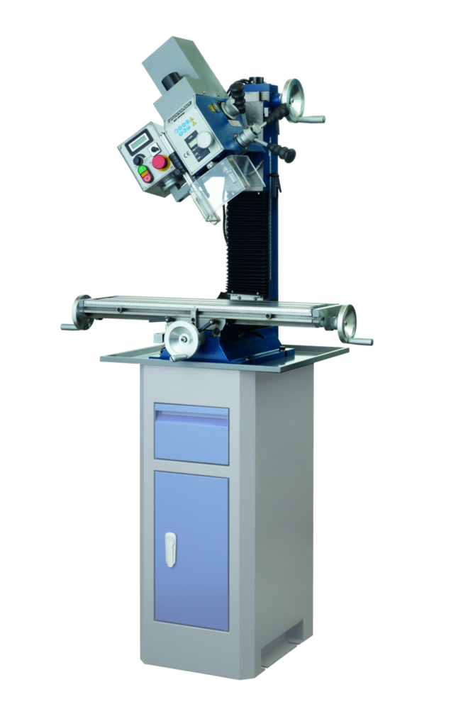 Die vielseitige Bohrfräsmaschine zum Bohren, Gewindeschneiden, Flach- und Vertikalfräsen. Es kann mit manueller Spindelhubbewegung oder mit manuellem Feinvorschub gearbeitet werden. Die Bohrfräsmaschine verfügt über eine variable Drehzahlregulierung. Die Maschine ist für das Gewindeschneiden mit einer Umkehrschaltung ausgerüstet. Sie verfügt über einen verstellbaren Späneschutz. Der Tisch kann quer über die Y- oder längs über die X- Achse verstellt werden. Der Bohrkopf lässt sich 90° nach links und 30° nach rechts schwenken.