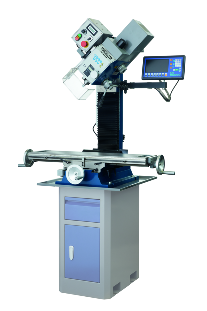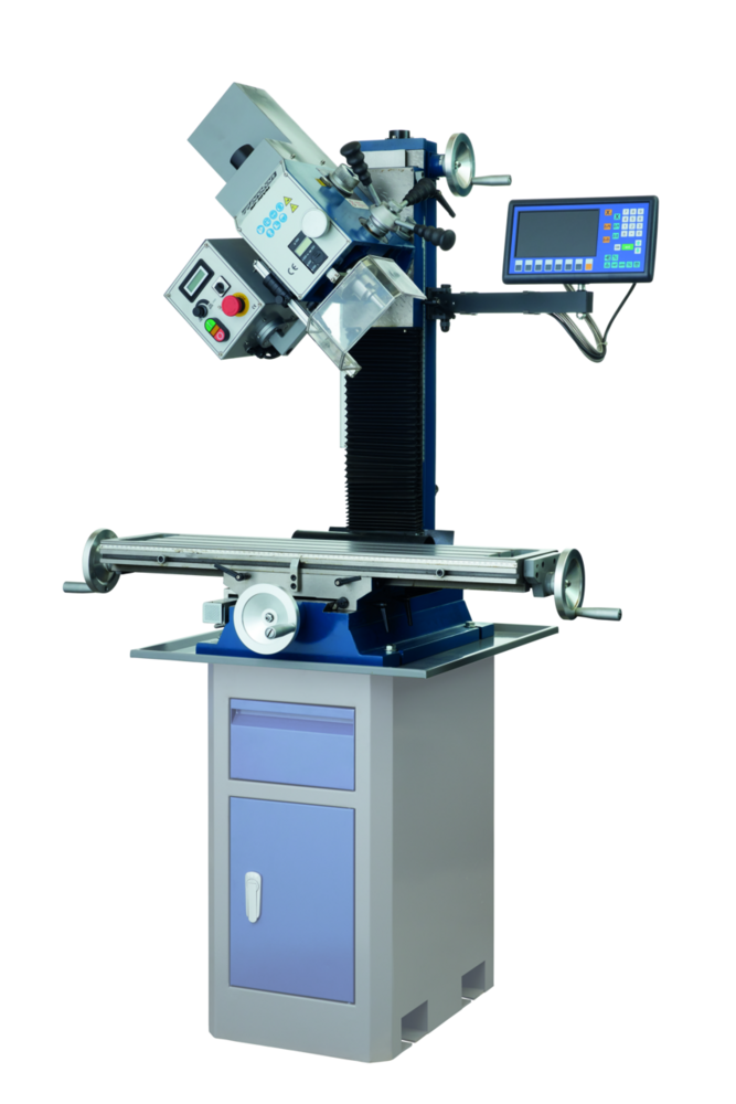 Die vielseitige Bohrfräsmaschine zum Bohren, Gewindeschneiden, Flach- und Vertikalfräsen. Es kann mit manueller Spindelhubbewegung oder mit manuellem Feinvorschub gearbeitet werden. Die Bohrfräsmaschine verfügt über eine variable Drehzahlregulierung. Die Maschine ist für das Gewindeschneiden mit einer Umkehrschaltung ausgerüstet. Sie verfügt über einen verstellbaren Späneschutz. Der Tisch kann quer über die Y- oder längs über die X- Achse verstellt werden. Der Bohrkopf lässt sich 90° nach links und 30° nach rechts schwenken. Die 3-Achs Digitalanzeige ermöglicht verschiedene Fräsungen mit präziser Einstellung der Achsen. Dank dem Display ist die Einstellung übersichtlicher und effizienter, es ermöglicht fehlerfreies Ablesen und unterstützt bei vielen verschiedenen Fräsungen.