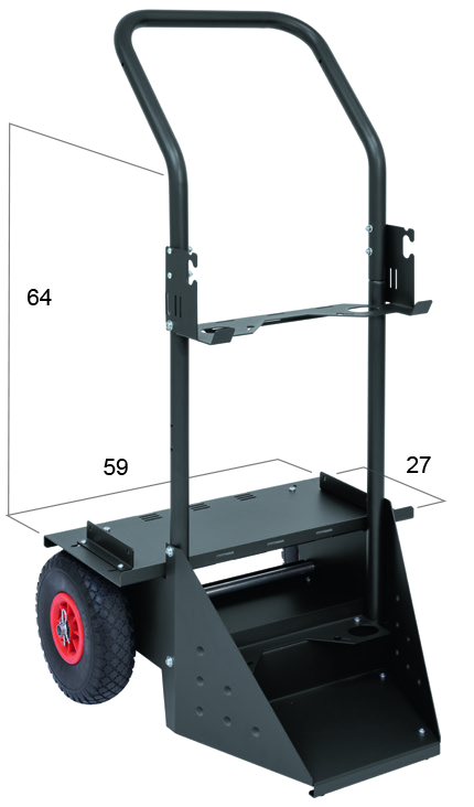 Der einfache Fahrwagen XL mit zwei grossen Gummilufträdern ist einfach und wendig. Auf der Rückseite hat er ein Tablar für Schweissanlagen, auf der Schaufelfläche auf der Vorderseite findet eine Gasflasche bis 10 m³ / 50l ihren Platz.