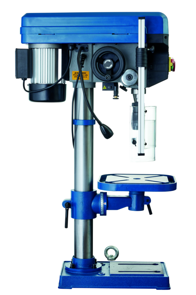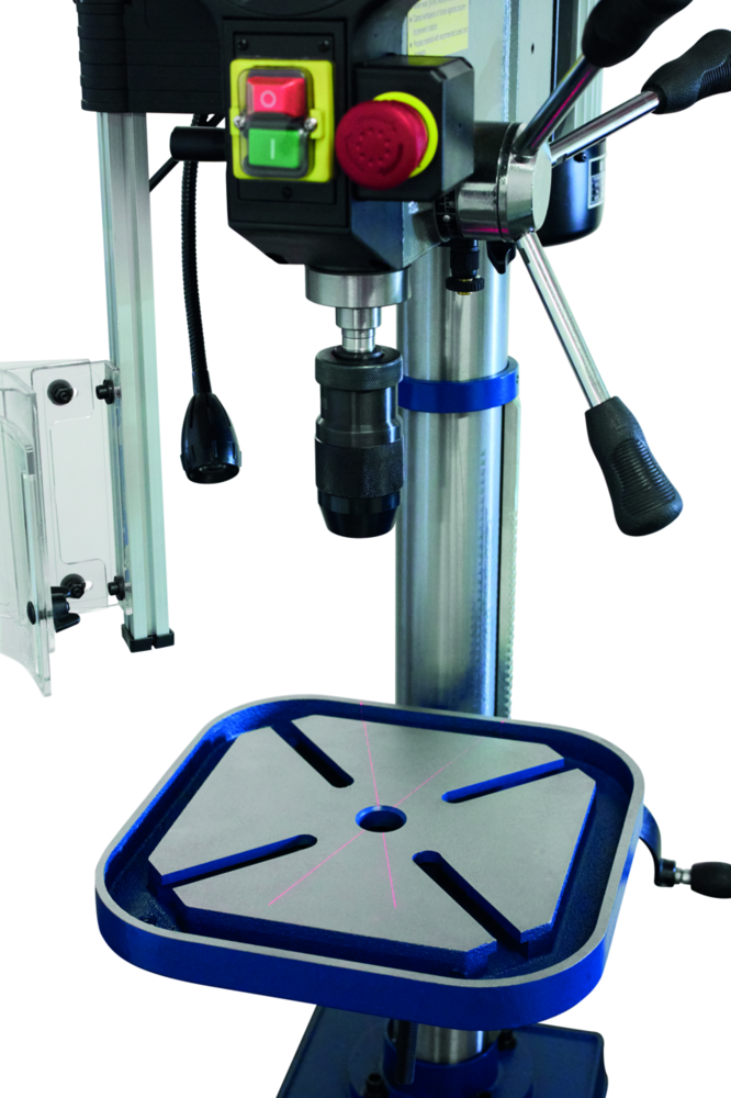 Ein integrierter Laser zeigt das Bohrzentrum an, während der Bohrtisch über eine Sechskantschraube (SW19) geneigt werden kann. Zwei Parallelnuten ermöglichen die Befestigung von Maschinenschraubstöcken oder Werkstücken mit Spannwerkzeugen. Die Tischhöhe lässt sich bequem über den Klemmring an der Säule verstellen.