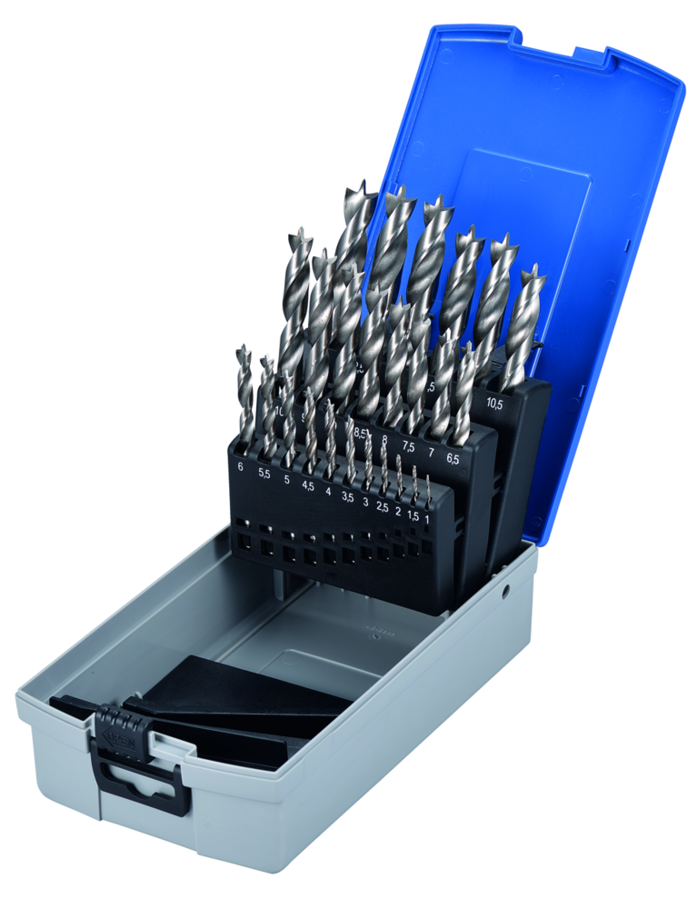 Die Bohrkasette D-25GSH ist gefüllt mit Holzbohrer 1 - 13 mm in einer 0.5 mm Abstufung. Die Holzbohrer eignen sich zum bohren in Weich- und Hartholz. Sie haben zwei scharfe schneiden. Das Bohrgut wird über die zwei Spiralnuten abtransportiert. Die Zentrierspitze hilft den Bohrern bei der Positionierung des Bohrloches und dient als Führung. Der Schaft der Bohrer ist zylindrisch.