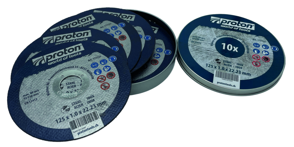für Stahl & Inox 125 x 1.0 x 22.23 mm Scheibe in Top-Ausführung für millimetergenaues und schnelles Trennen bei minimalem Kraftaufwand. Keine Gratbildung, keine thermische Blaufärbung. Packung an 10 Stk. in ALuminiumdose
