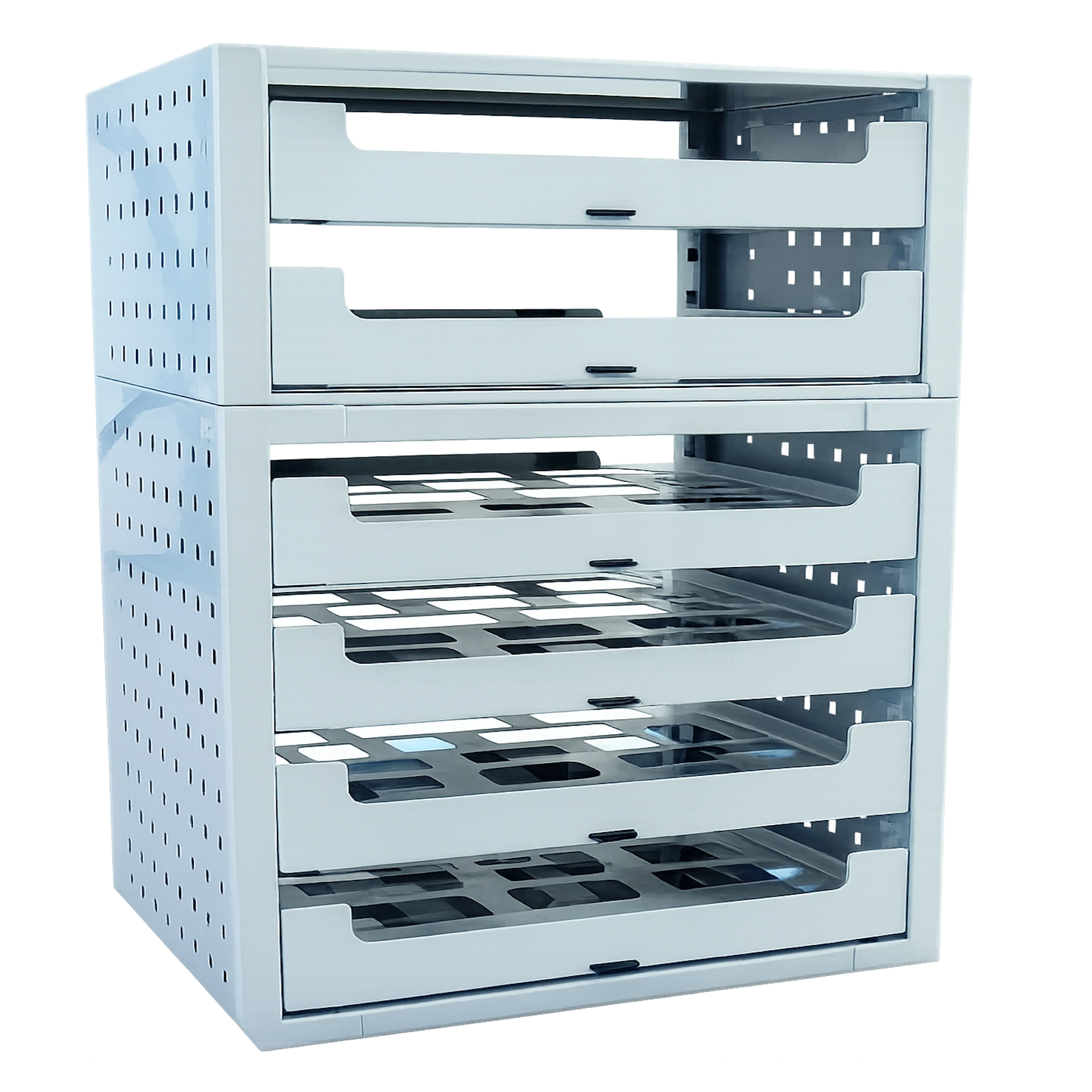 3 Schubladen ohne Koffer, 507 x 360 x 483 mmDie leeren Kofferschränke bestehen aus einem thermolackierten Stahlgehäuse. Fast alle Elemente sind gelocht, um Gewicht zu sparen. Die Koffertablare sind durch stabile Führungsschienen geführt und tragen je 50 kg. Die Seitenwände sind mit einer Loch-Rasterung für Haken versehen. Höhe Schubladen 66 / 100 / 130 mm
