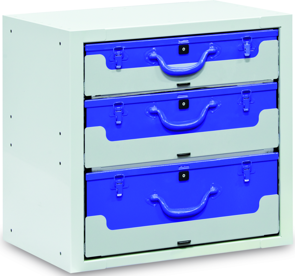 Die leeren Kofferschränke bestehen aus einem thermolackierten Stahlgehäuse. Fast alle Elemente sind gelocht, um Gewicht zu sparen. Die Koffertablare sind durch stabile Führungsschienen geführt und tragen je 50 kg. Die Seitenwände sind mit einer Loch-Rasterung für Haken versehen. Höhe Schubladen 66 / 100 / 130 mm