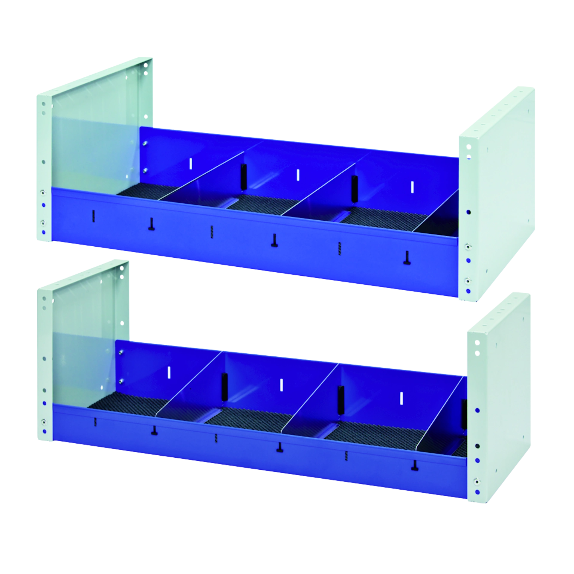 3 Trennbleche, 760 x 260 x 161 mmDas Regal besteht aus mit Epoxydpulver lackiertem Stahl; seine Tiefe beträgt 260 und 360 mm, während man verschiedene Längen zur Verfügung hat. Jeder Länge entspricht eine bestimmte Anzahl von Trennwänden.