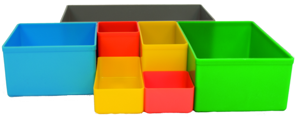 Mit Kunststoff-Einsatzboxen lassen sich Leerkoffer individuell bestücken. Ebenso können sie zur Unterteilung der Schubladen eingesetzt werden. Es sind 2 Höhen verfügbar.