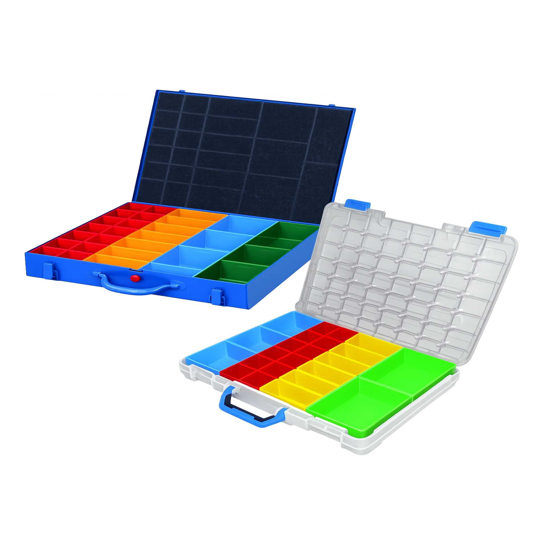 46 BoxenDie Linie der professionellen Sortimentskoffer dient dazu, Kleinteile sauber aufzubewahren und sicher zu transportieren. Es sind verschiedene Einteilungsmöglichkeiten anwendbar. Die selbstschliessende Verriegelung aus Stahl verhindert ein unbeabsichtiges Öffnen der Koffer. Die Thermolackierung schützt das Stahlblech vor Rost. Der integrierte Schaumstoff schützt die Kleinteile und verhindert ein herumrutschen.