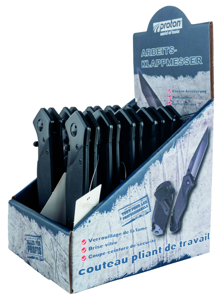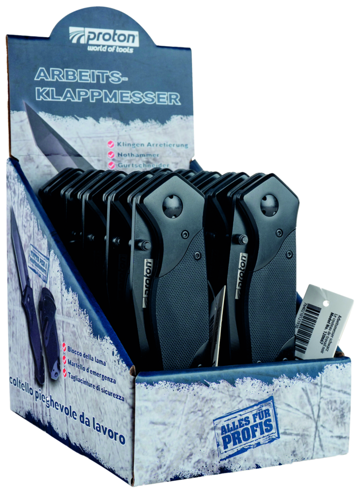 Handliches Arbeitsmesser mit Klingenarretierung, Nothammer und Gurtschneider für mehr Sicherheit im täglichen Umgang. Display 10 Stk.
