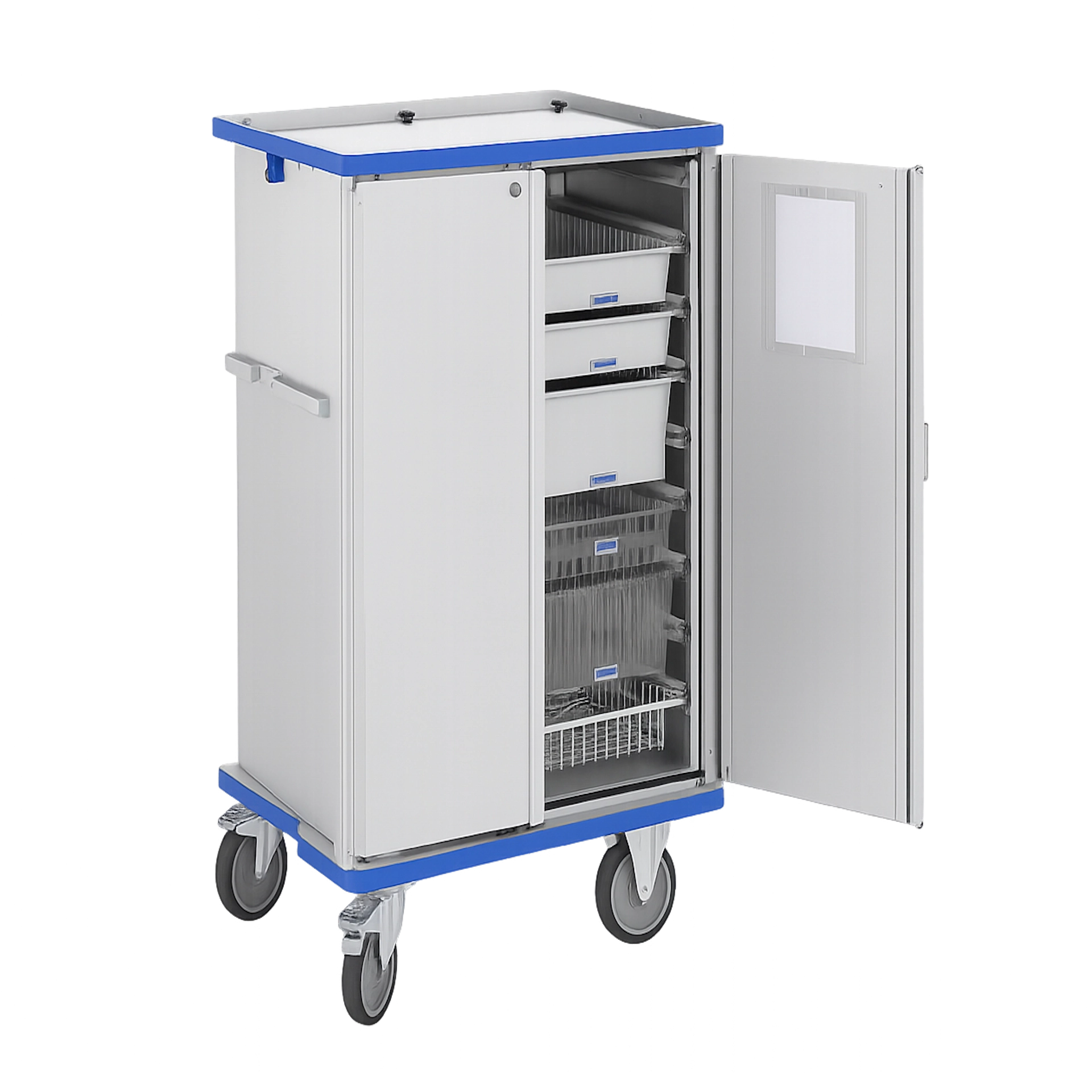 Eine umlaufende EPDM-Dichtung an Türen, Boden- und Dachprofil verbessert die Geräuschdämmung und bietet zuverlässigen Staubschutz. Der glatte Innenraum ermöglicht ein einfaches Reinigen, herausnehmbare Fachböden schaffen gleichhohe Ablagefächer und sind jeweils bis 100 kg belastbar. Ergonomische Zieh- und Schiebegriffe an beiden Stirnseiten sowie ein umlaufender blauer PVC-Stosspuffer am oberen und unteren Wagenrand gewährleisten komfortables und sicheres Handling.