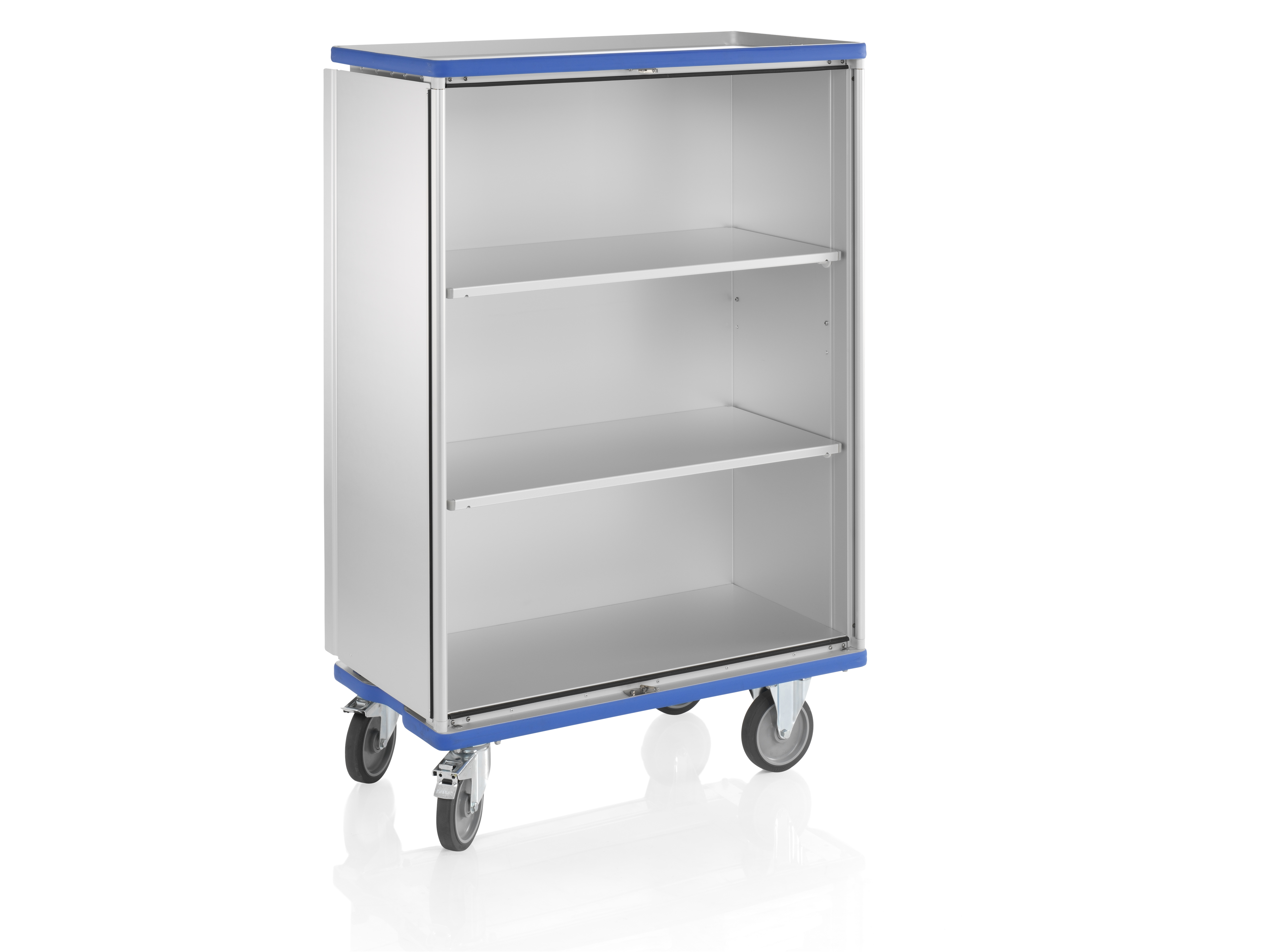 Eine umlaufende EPDM-Dichtung an Türen, Boden- und Dachprofil verbessert die Geräuschdämmung und bietet zuverlässigen Staubschutz. Der glatte Innenraum ermöglicht ein einfaches Reinigen, herausnehmbare Fachböden schaffen gleichhohe Ablagefächer und sind jeweils bis 100 kg belastbar. Ergonomische Zieh- und Schiebegriffe an beiden Stirnseiten sowie ein umlaufender blauer PVC-Stosspuffer am oberen und unteren Wagenrand gewährleisten komfortables und sicheres Handling.