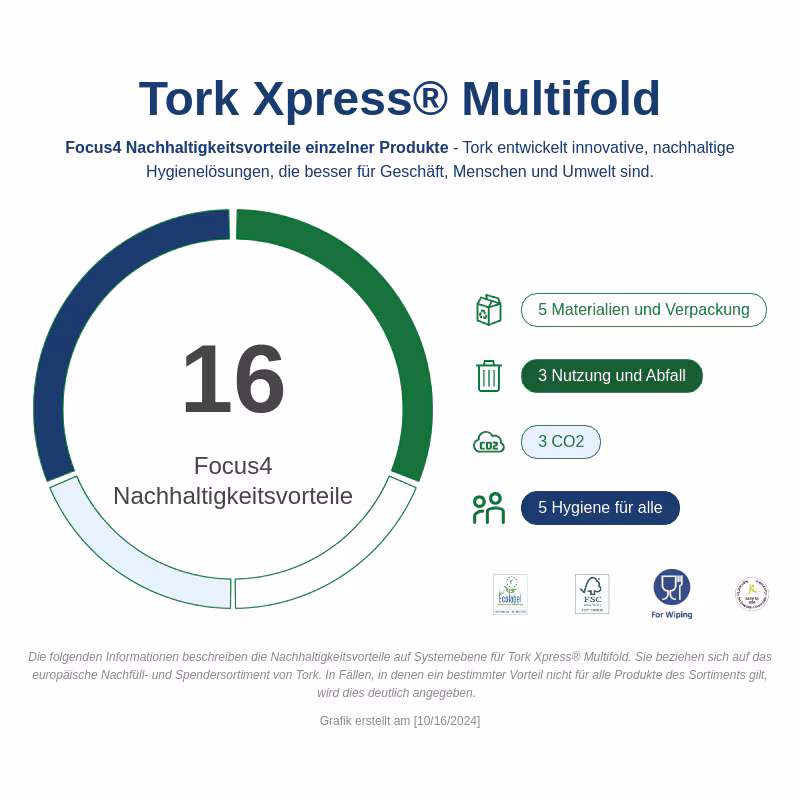 Ermöglichen Sie Ihren Gästen ein besseres und angenehmeres Händetrocknen: Bieten Sie ihnen die großen, weichen Tork Xpress® Multifold Handtücher in Premium-Qualität, die sanft zu den Händen sind und sich hochwertig anfühlen. In Kombination mit Tork Xpress® Spendern für Multifold Handtücher eignen sich die Handtücher für Waschräume mit mittlerer Besucherfrequenz. Sie finden auch auf begrenztem Raum Platz und bieten Ihren Gästen Komfort und Hygiene.